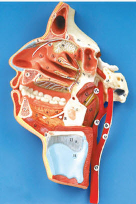该模型显示头面部内侧面,口、鼻、咽、喉内部结构以及脑血管和脑神经等结构,共有51个部位指示标志。