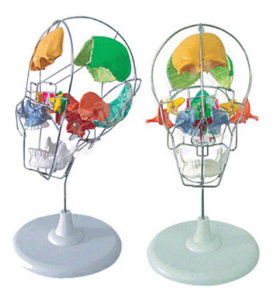 成人分离头颅骨着色模型为金属管穿接,固定在基板上,可分解成16个部件, 颅骨用彩色标记, 显示脑颅骨和面颅骨形态结构特点,共由23块颅骨组成。