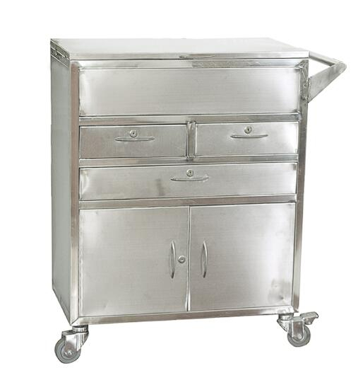 3、结构:车身正面有两层抽屉,下部为对开式带锁柜子;车身一侧带有推车把手,便于医护人员推行;
