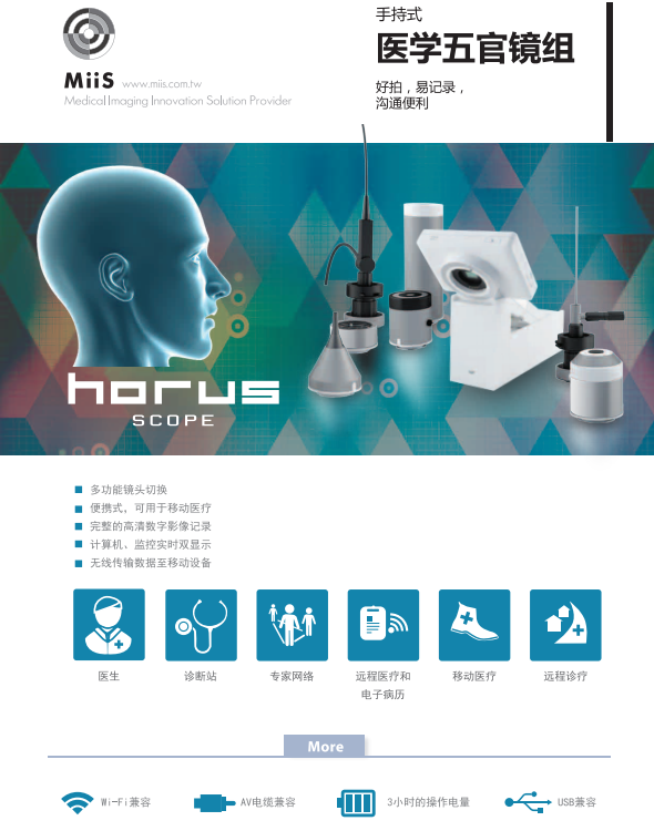 赫罗斯Miis数位五官镜组DSC100,创新的手持式数位五官镜,预期以数位整合的方案取代传统的眼底镜、耳镜及及肤镜。以数位装置拍摄取得眼底、外耳导和鼓膜、表皮及真及的皮肤照片,不仅可以广泛的应用于医院、诊所、专业设理设施及医疗保健站,其数位化优点可用于远距医疗方案的整合,提供全方位的医疗照护。