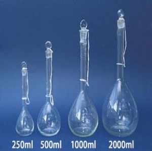 容量瓶是为配制准确的一定物质的量的浓度溶液用的精确仪器。它是一种带有磨口玻璃塞的细长颈、梨形的平底玻璃瓶,颈上有刻度。当瓶内体积在所指定温度下达到标线处时,其体积即为所标明的容积数。常和移液管配合使用。容量瓶有多种规格,小的有1ml、2ml、5ml、25ml、50ml、100ml,大的有250ml、500ml、1000ml、2000ml等。它主要用于直接法配制标准溶液和准确稀释溶液以及制备样品溶液。容量瓶也叫量瓶。