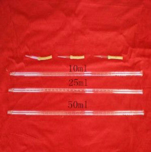 滴定管(burette)分为碱式滴定管和酸式滴定管。前者用于量取对玻璃管有侵蚀作用的液态试剂;后者用于量取对橡皮有侵蚀作用的液体。滴定管容量一般为50mL,刻度的每一大格为1mL,每一大格又分为10小格,故每一小格为 0.1mL。精确度是百分之一。即可精确到0.01ml . 滴定管为一细长的管状容器,一端具有活栓开关,其上具有刻度指示量度。一般在上部的刻度读数较小,靠底部的读数较大。