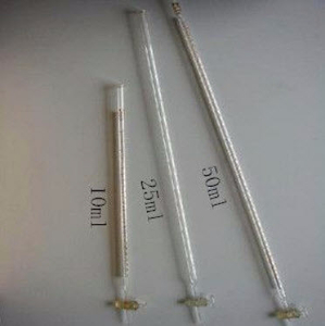 滴定管(burette)分为碱式滴定管和酸式滴定管。前者用于量取对玻璃管有侵蚀作用的液态试剂;后者用于量取对橡皮有侵蚀作用的液体。滴定管容量一般为50mL,刻度的每一大格为1mL,每一大格又分为10小格,故每一小格为 0.1mL。精确度是百分之一。即可精确到0.01ml . 滴定管为一细长的管状容器,一端具有活栓开关,其上具有刻度指示量度。一般在上部的刻度读数较小,靠底部的读数较大。