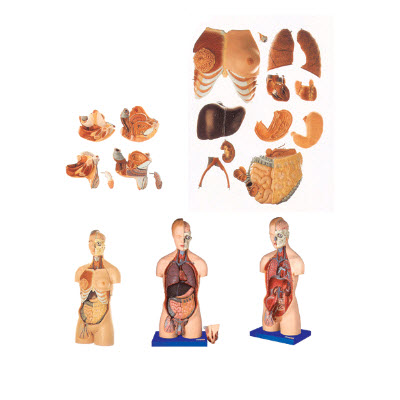 ■ 该模型由胸壁、胸腹腔内脏器官以及男、女性生殖器官等20个部件组成,并显示人体半身头颈部躯干的颅脑,胸腹腔内脏器官以及男、女两性互换的生殖器官等结构,共有200个部位指示示标志。