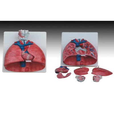 本模型自然大小,分成7件。两瓣肺叶可取下示其内部结构。心脏纵剖示心房、心室和瓣膜。喉头也分成两件。置于底座上。尺寸:36x23x12CM.