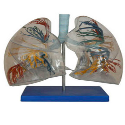 本模型供医学院校讲解人体解剖学、胸外科和内科等课程时作直观教具用。显示左右两肺的分段,左肺八个段,右肺十个段,从透明肺壳可以观察支气管树的分布情况。本模型肺外形用透明塑料制,气管和支气管树用塑料制。用PVC制成,安放于塑料座上。2倍放大。