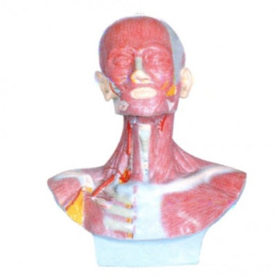 BM1276头、面、颈部解剖和颈外动脉配布模型主要示表情肌、咀嚼肌、颈部肌群、胸部、背部部分肌肉及颈外动脉的分布,适用于中等学校、卫校、医学院校在人体解剖学教学时作为直观教具。
