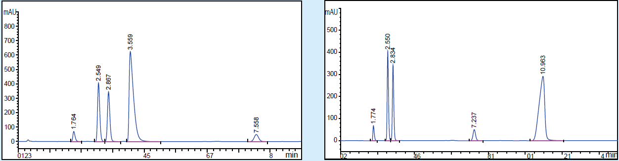(当流动相的pH值从2.6变为5.8时,阿米替林的保留时间从3.559min变为10.963min)