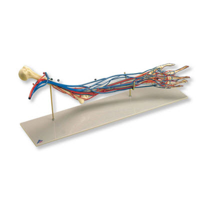 实物大小的左臂和左手,半屈,包括腕动脉、桡骨动脉、尺骨动脉并伴有根定点静脉。手部的整个血液循环系统在手心和手背都作显示。不同血管的大小对比关系清晰,简化了对手臂血液循环的学习和研究。 置于基架上。