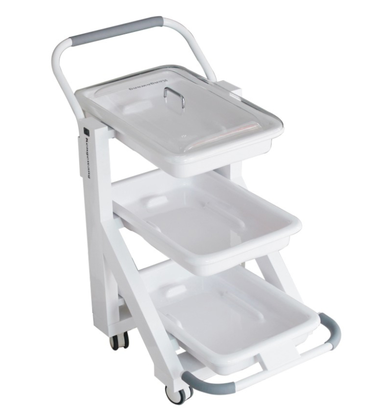 肯格王专用内镜转运车是由肯格王自行研发的专利产品,其周转箱材料亦由制造清洗槽台面的高分子复合材料独立开模制成,车体由不锈钢喷塑而成,具有耐腐蚀、不沾水、车行顺畅、取放方便等优点。盆内内镜存放导航隔条使污染部位和非污染部位分离。多层设计使客户在使用过程中可将清洁和污染的内镜分层标明后置放,可达到高效周转,避免交叉感染等功效。