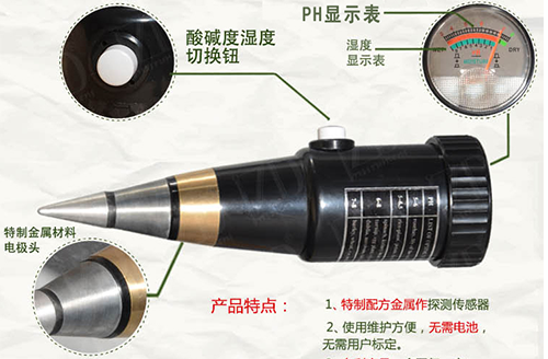 PHT-102型土壤酸度检测仪,可测量土壤PH值和土壤湿度,仪器采用特制金属材料电极头,更精准更耐用,使用简单方便,无需电池,直接插入土壤使用;设计精良,测量准确,经济实用,完全符合适合室内、室外测试需要,深受广大用户的青睐。