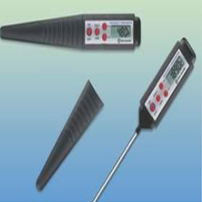 这种温度计采用了独特的扁平外形设计,重量28.3克,配有集成的衣袋夹,非常适合放在衬衫口袋中携带。它的量程是-50到572°F、-50到300℃。它的探针可以插入任何溶液,数字分辨率在-20到200°间可达0.1°(此范围之外则为1°),精度为±1.5℃。UltraTM型则在测试点达到±0.4℃的精度。它配有一只“保持”键,按下该键可使读数锁定,以待稍后读取;另外一只键则用于在华氏度(℉)和摄氏度(℃)之间切换。