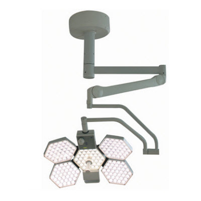 SY02-LED系列LED无影灯有5个和3个多透镜光源矩阵组合而成,其中每个多透镜光源矩阵包含了一定数量的LED(发光二极管)光源,而每个LED光源均可单独发光并经各自的反射面反射,再经过汇聚型光学透镜在手术区域形成不同聚焦置的光域,这些光域的组合实现了表面和深部超强且均匀的照明效果,可以满足各种手术的需要。