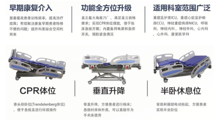 床面可垂直升降 → 方便轮椅到病床转移;急救时床体升高,可作为手术床