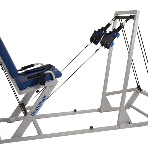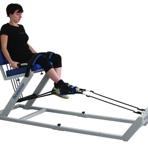 Flextensor型开链渐进式阻力训练器主要用于训练股四头肌和膝关节屈肌,得益于其渐进式阻力的设计,在康复初期即可进行训练;随着膝关节力量及活动度逐步得到加强,患者可以进行高角速度训练。在训练过程中,不断进行的离心和向心训练不断刺激膝关节的伸屈肌,也可模拟进行高速步态运动训练(perform gestural movements at maximum speed),是膝关节康复和运动员训练的理想设备。可进行单向(monopodalic)或双向(bipodalic)的伸展、屈曲或伸屈训练;配置有四根伸展弹力管和二跟屈曲弹力管;可进行向上屈曲训练(Upper Flex)以增强关节活动度