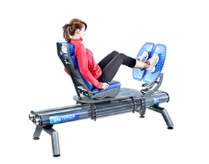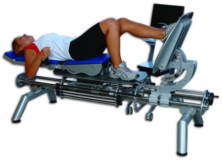 Leg Tensor型下肢运动闭合链康复器是一款创新的仪器,可进行闭锁运动链的训练(CKC),可对下肢进行同心、离心和超等长训练(增强式训练)。Leg Tensor利用一组弹性带提供阻力,这些弹性带可对训练负载进行精调。这可使患者轻松地从对关节冲击力较低的低负荷(为康复第一阶段所必需)增加到更高负荷和跳跃(为完全恢复所需)。训练过程中可通过预先定义的弹性阻力来控制加速和减速级别,使Vector成为肌力强化训练(如传统的蹬腿训练)和超等长训练(无重力负荷)的卓越训练工具。运动员可进行可控负载跳跃,不用担心存在关节或肌肉过度负载的危险。通过进行人体轴向负载训练,较早地开始训练患肢(视体重患者而定),以增强爆发力和抗阻力,从而改善神经肌肉系统的协调性和肌肉弹性。