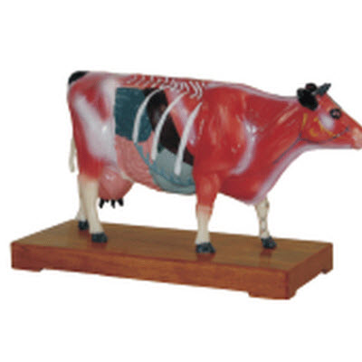 本模型显示牛体左半部68个常用穴位,穴位用数字标注。右半部显示解剖面。用PVC制成,供兽医作参考用。