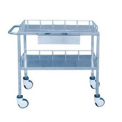 治疗车分为上下两层,均带有不锈钢护栏,由Φ12mm和Φ5mm不锈钢棒加工而成,防止物体滑落