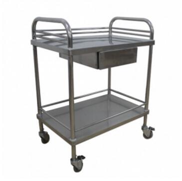 不锈钢治疗车双层设计,每层下面均焊有支撑管,三面护栏。