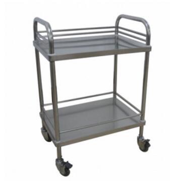 不锈钢治疗车双层设计,每层下面均焊有支撑管,三面护栏。