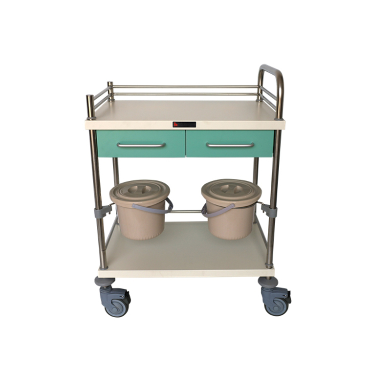 备注:钢制+优质不锈钢或铝合金材质,两只全封闭抽屉;两只污物桶,高端脚轮,前两轮带刹