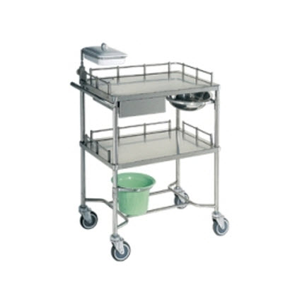 治疗车分下两层,三面护栏。顶层配有抽屉,采用静音滑轨,抽拉轻松灵活,可存放一次性输液器、棉签、纱布等,另配有不锈钢污物盆、针剂盘;底层带塑料污物桶,方便实用。