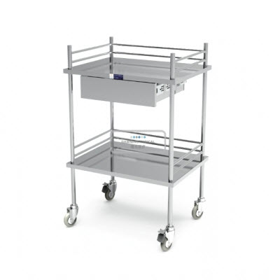 车体分两层台面,三面不锈钢护栏,保证东西不掉落;底部增加加强筋,保证载重安全可靠;上层带一抽屉,高级静音滑道,抽拉灵活无噪音;