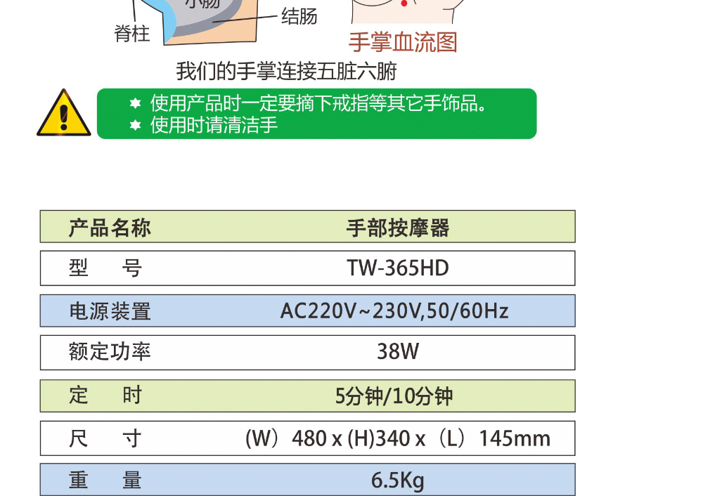 1.该产品(手部按摩器 TW-365HD)可能含有禁忌内容或者注意事项,具体详见说明书;