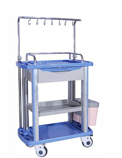 2、两层ABS台面,一个抽屉,单层不锈钢输液架,配固定式输液挂钩6个,两个ABS污物桶,底部4寸静音脚轮,其中两只带刹车。