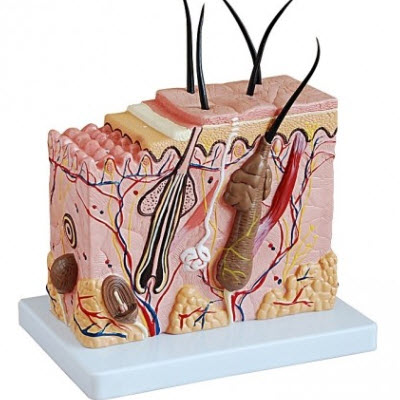 本模型显示了不同层面的人类皮肤层次及毛发结构,展示了毛发、毛囊、脂腺、汗腺、皮肤感受器、神经和血管。