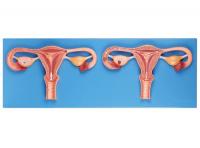 XM-819卵子受精过程放大模型由女性生殖器官冠状切面(一个切面有精子进入,另一个切面有卵子受精后胚泡植入了宫内膜)的两个部分组成,并显示精子进入女性生殖器官,卵子与精子相遇受精后胚泡植入子宫内膜等结构,共有15个部位指示。