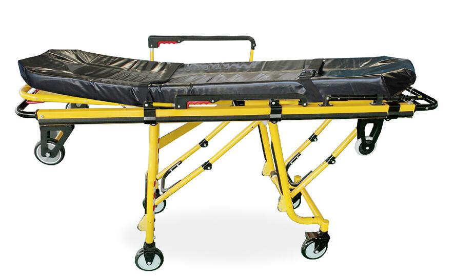 上车部位有两个轮子,高度可三档调节,适合不同高度的车厢,上到救护车时最低高度是64cm。 防水海绵垫,背部可调节,使病人舒适。