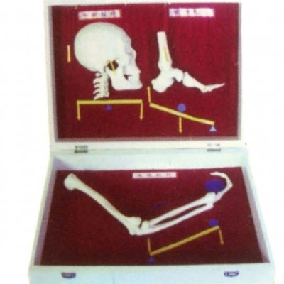 由头颅骨(含下颌骨)的矢状切,第1-5颈椎的矢状切,胫骨和腓骨下段、距骨、肱骨、前臂骨、手骨(示手舟骨、头状骨、第三掌骨和中指骨)等组成。