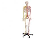 人体骨骼附动脉和神经分布模型适用于中等医院院校在讲解人体解剖关于埃及和神经分布时作为直观教具,使学生了解人体全身主要血管和神经的行程及其分布情况,模型系在人体骨骼的左半侧显示主要神经血管的行程;主动脉全程分为升主动脉、主动脉弓及降主动脉三段,头颈部左侧的主要动脉为起自主动脉弓的左颈总动脉和 左锁骨下动脉,上肢动脉由锁骨下动脉延伸为腋动脉,肱动脉,肘部以下的桡动脉,尺动脉等,降主动脉分胸主动脉及腹主动脉两段。