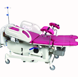 ?床面整体升降、背板折起、整床的前后倾均为电动马达控制,腿部脚撑可脱卸,座板下配有污物盘。两侧可前后移动的搁腿 架,隐藏式辅助台、翻动式脚撑的结合使用,有助于孕妇分娩姿势的调节和助产师的接生工作。