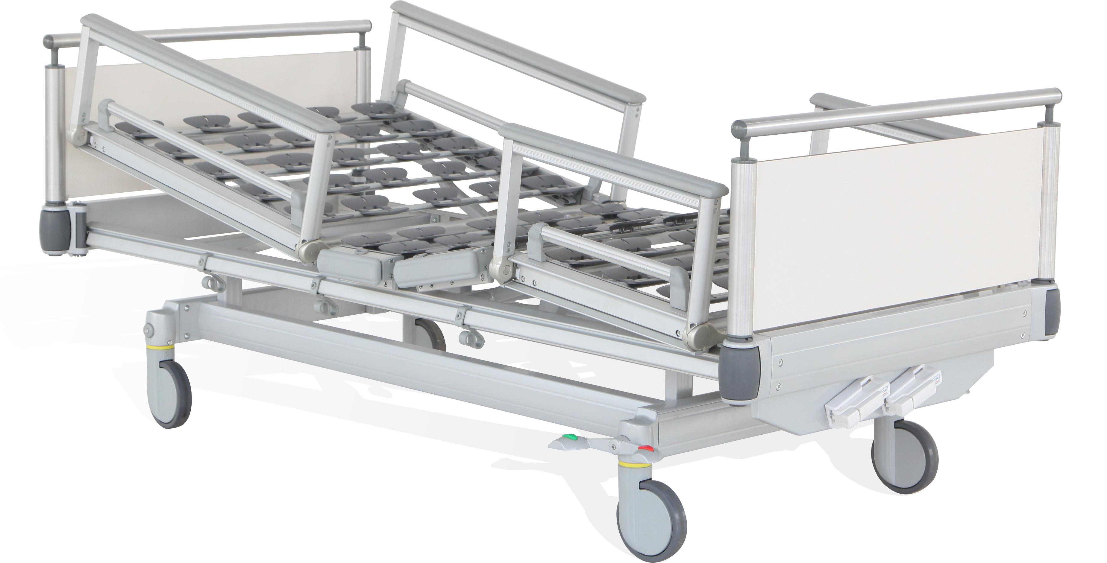 (3)床面分成四段,有手摇柄控制体位变化,四周为铝合金框架,全封闭,易清洁,耐化学品腐蚀。其背板、臀板、大腿板、小腿板的黄金比例分布背板长达90cm,整体床垫补偿装置和床头板斜面使背板定位更符合人体工程学原理,从而避免患者由病床滑落,同时可减轻患者腹部的压力,从而使呼吸更顺畅。