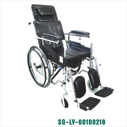 半躺轮椅,固手,骨科腿,18寸背垫,带坐便器皮革硬座,皮革头垫、头枕,铝前叉,8*2PU前轮,24寸铁圈,塑料手轮,充气后轮,塑料踏板。