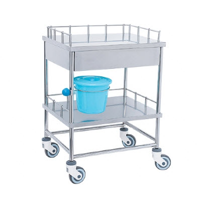 2.双层设计,每层下面均焊有支撑管,三面护栏。顶层配有抽屉,采用静音滑轨,抽拉轻松灵活,可存放一次性输液器、棉签、纱布等,底层带塑料污物桶,方便实用。