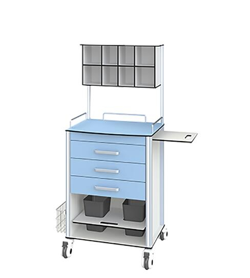 2、配双层四连翻斗式透明药盒,配三层抽屉,抽拉隐藏式抗倍特板副工作台,中间有一个隔板,配两个垃圾桶。侧面有心肺复苏板,配静音万向脚轮4只,带对角刹车。