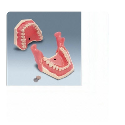 用于局部麻醉的牙科模型,上下颌相连。内置微电子电路,上颌3个接触点,下颌2个接触点,下颌骨2点接触点,正确注射后有声音信号。弹性牙龈,模拟真实性口内情况,具有良好的教学效果。用于模拟练习口腔局部麻醉