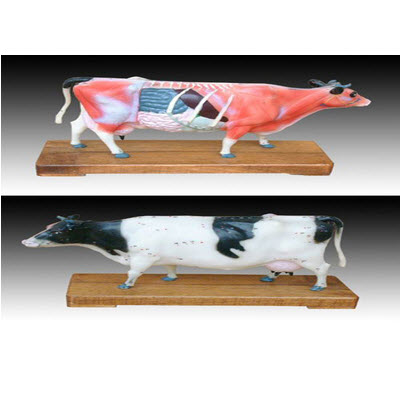 本模型显示牛体左半部68个常用穴位,穴位用数字标注。右半部显示解剖面。用PVC制成,供兽医作参考用。