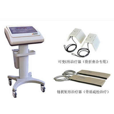 由主机和治疗器两部分组成。在计算机控制下产生的仿生脉冲电流波形,经过驱动器,馈送到各电磁耦合器, 产生脉冲磁场。两套热磁治疗器,是根据人体的脊椎和肢体结构特征设计,具有不同磁极性,产生的脉冲磁场和红外热,作用于人体。在脉冲磁场和红外热作用下,改善骨质疏松引起的疼痛等临床症状,干预骨代谢,提高成骨细胞活性,增强成骨能力,达到治疗骨质疏松症、骨折及其它骨病的目的。