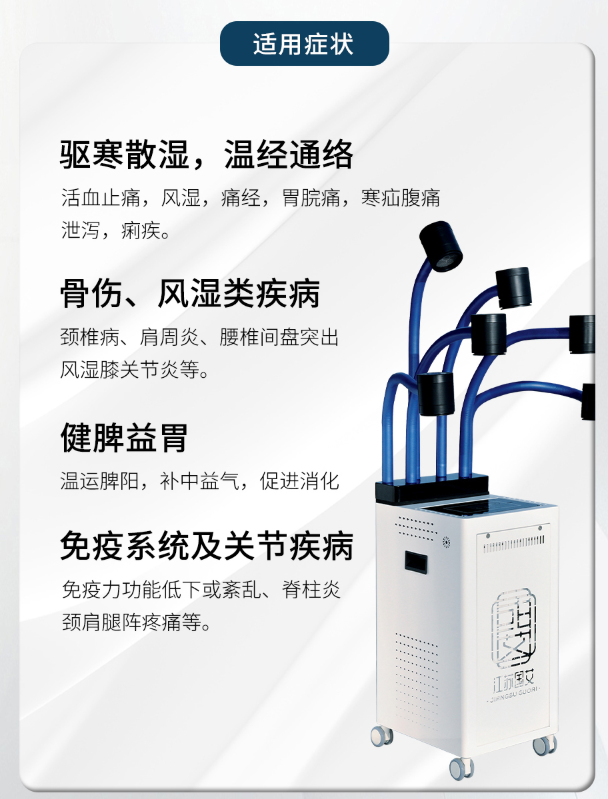 本产品由机箱、立柱、悬灸头、电动升降、烟雾净化、电器控制系统、灸材(由艾绒制成)组成。
