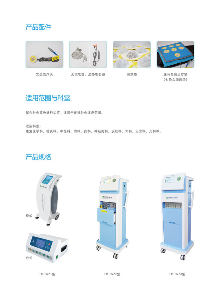 治疗原理:温热电灸综合治疗仪(多功能艾灸治疗仪)是根据传统艾灸疗法的原理,结合现代的电子技术,实现传统艾灸疗法的现代艾灸仪器,并同时具有磁疗、温针、电针、温热电针、无创针灸等功能于一体,多元化治疗的设备,适用于针灸、艾灸配合治疗。