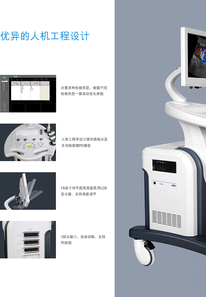 特点:1、15英寸纯平超高亮度医用LCD显示器,支持角度调节2、3探头接口,自由切换,支持热拔插4、DICOM3.0接口,具备网络远程协助工具,可有技术人员通过网络远程维护系统5、内置图为一体化工作站,具备典型病案例导入导入,实现自动快捷诊断6、内置工控PC平台