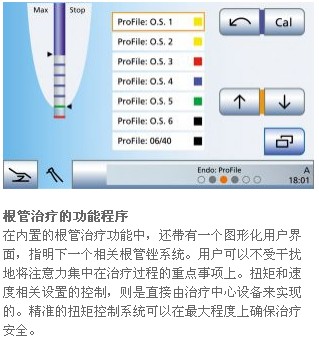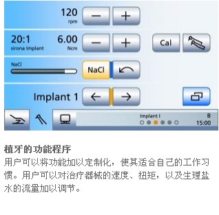 对于根管治疗和种植的功能项,可以直接通过EasyTouch触摸屏用户界面来控制。通过这种方式,用户可以对诸如扭矩、速度、根管长度以及冷却液的流量加以控制