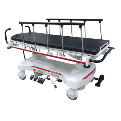 该车采用国际先进的中控刹车系统,Φ200防尘脚轮使平车运动稳定、可靠、轻巧。床身升降、倾斜及反倾斜由床体两侧踏板操作,使用方便;床头尾设有中央控制刹车踏板;底罩采用ABS材质一体成型,方便清理。车面为分体结构,上体采用大型油压杆支撑梁柱设计,床身不会摇晃。配铝合金全倒式护栏、输液架、引流挂钩。是急诊室、ICU、病房据推运病人及当急诊床、ICU床的*佳选择