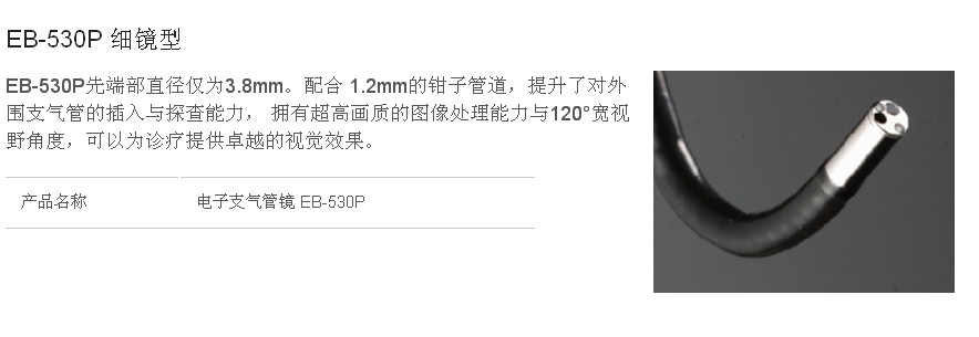EB-530P先端部直径仅为3.8mm。配合 1.2mm的钳子管道,提升了对外围支气管的插入与探查能力, 拥有超高画质的图像处理能力与120°宽视野角度,可以为诊疗提供卓越的视觉效果。