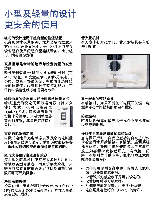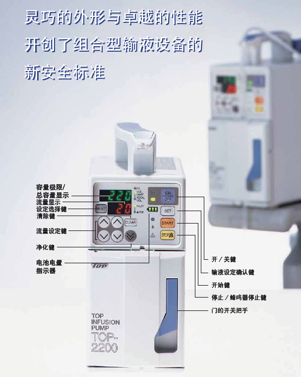 TOP-2200型输液泵的小巧设计,既节省了空间、又轻便、且容易设置。输液速度可通过输液的滴数和流量进行设定 电磁适合性的