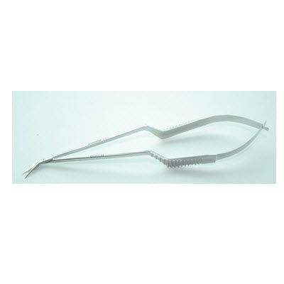 80度角枪形显微剪,用于神经外科手术,剪刃长10mm,总长19cm。